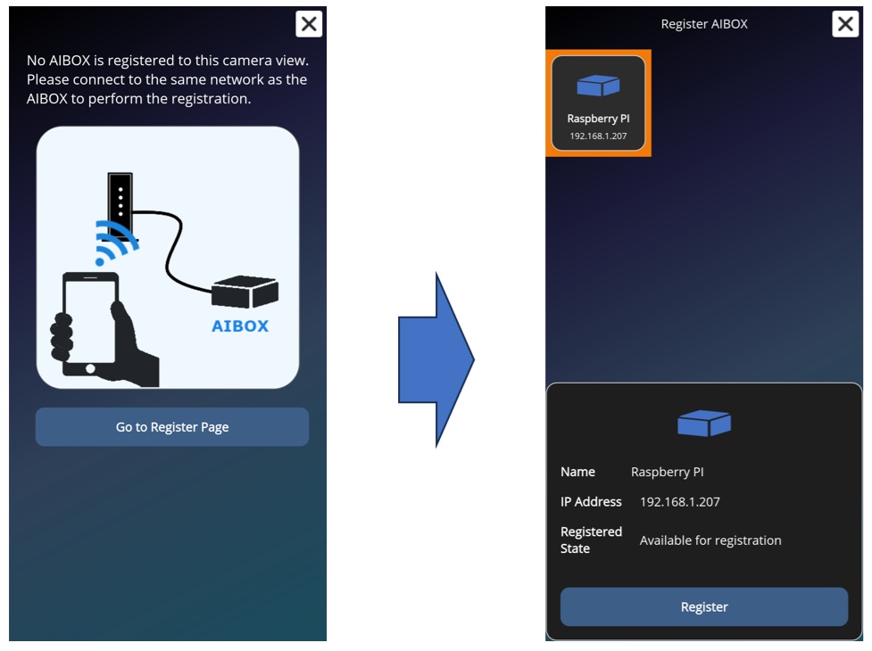 When you connect AIBOX and your smartphone to the same network (LAN), the AIBOX will be displayed. Select it and tap "Register".