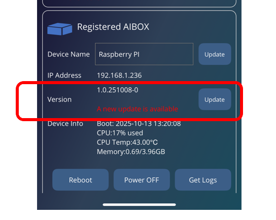 Open the settings screen and verify the version information under Registered AIBOX Information.