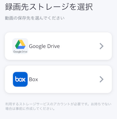 録画先の「設定」ボタンを押すと、クラウドストレージの選択画面が表示されますので、利用するストレージを選択してください。