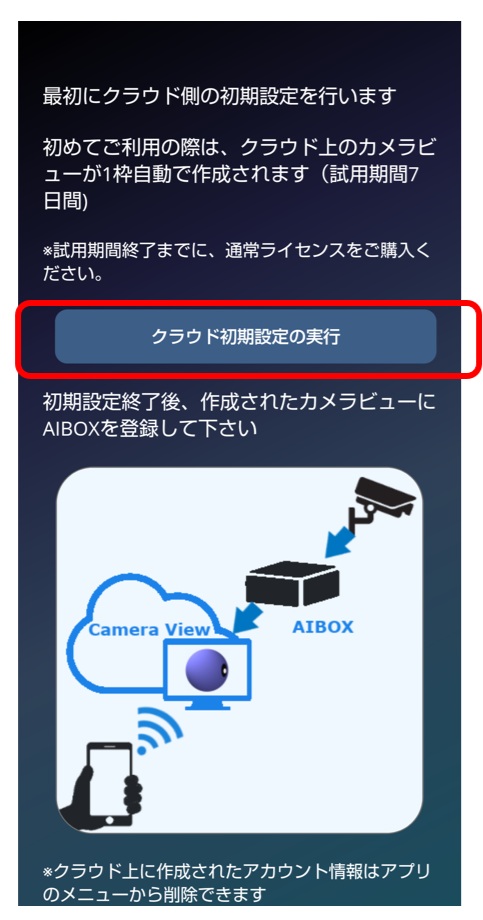 「クラウド初期設定の実行」をタップして、クラウドの初期設定を実行してください。