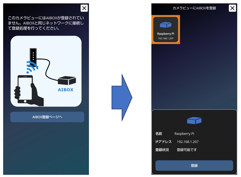 AIBOXとスマホを同じネットワーク(LAN)に接続すると、AIBOXが表示されますので、選択して「登録」をタップしてください。
