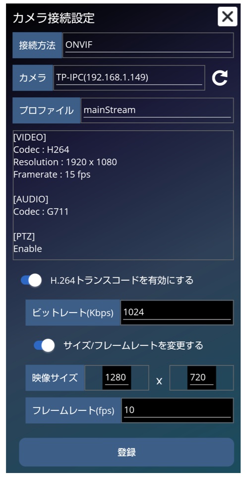 ただし、H.264トランスコードを有効にすると、AIBOXの処理負荷が上がりますので、カメラから配信される映像のプロファイルは、なるべくサイズやフレームレートの低いものを選択してください。