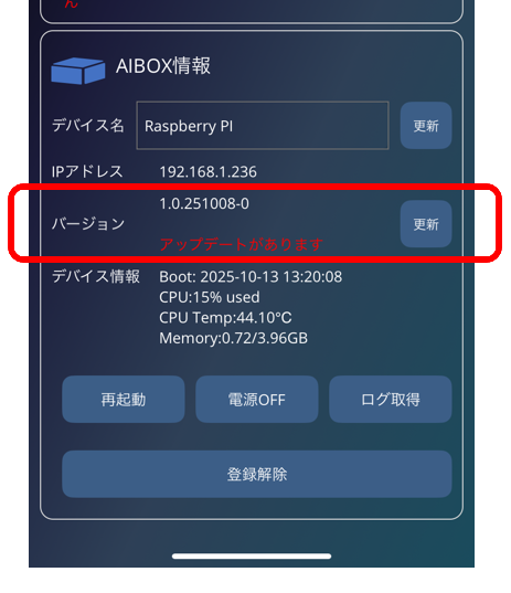 アップデートがある場合は、赤字で表示されていますので、「更新」ボタンを押してAIBOX OSのアップデートを実行します。