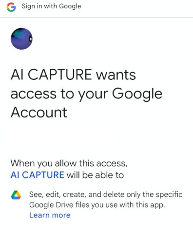 After signing in to the storage service, a screen to grant permissions to AI CAPTURE will appear. Please grant the displayed permissions.