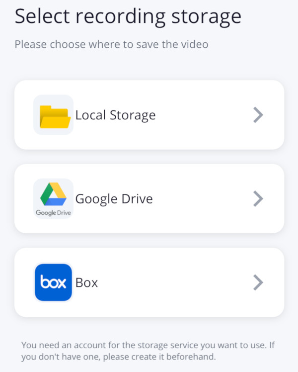 Press the "Settings" button for recording destination, and the recording storage selection screen will appear. Please select the storage you wish to use.